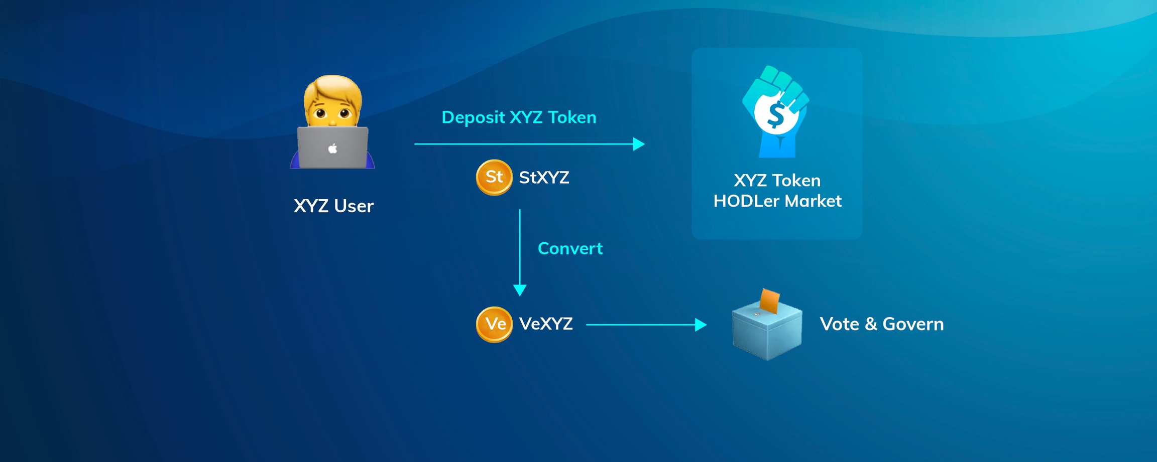 DAO or projects can utilize HODLer Market to generate governance tokens to further facilitate their own governance. Once the community starts to deposit and lock their token in the HODLer market, they will receive a staked token (stToken) to represent their positions. DeFiner also provides a tool to convert the stToken into a voting token (veToken). Based on the number of stToken and lock period, the community will get veToken. The community can use these veToken to participate in their own governance process.